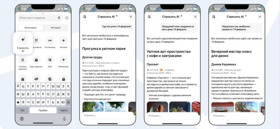 В ИИ-чате Яндекс Карт теперь можно выбрать место для оригинального свидания. Искусственный интеллект поможет спланировать, как провести день насыщенно, порекомендует необычное заведение на вечер или предложит интересные места в городе с учётом предпочтений пользователя.